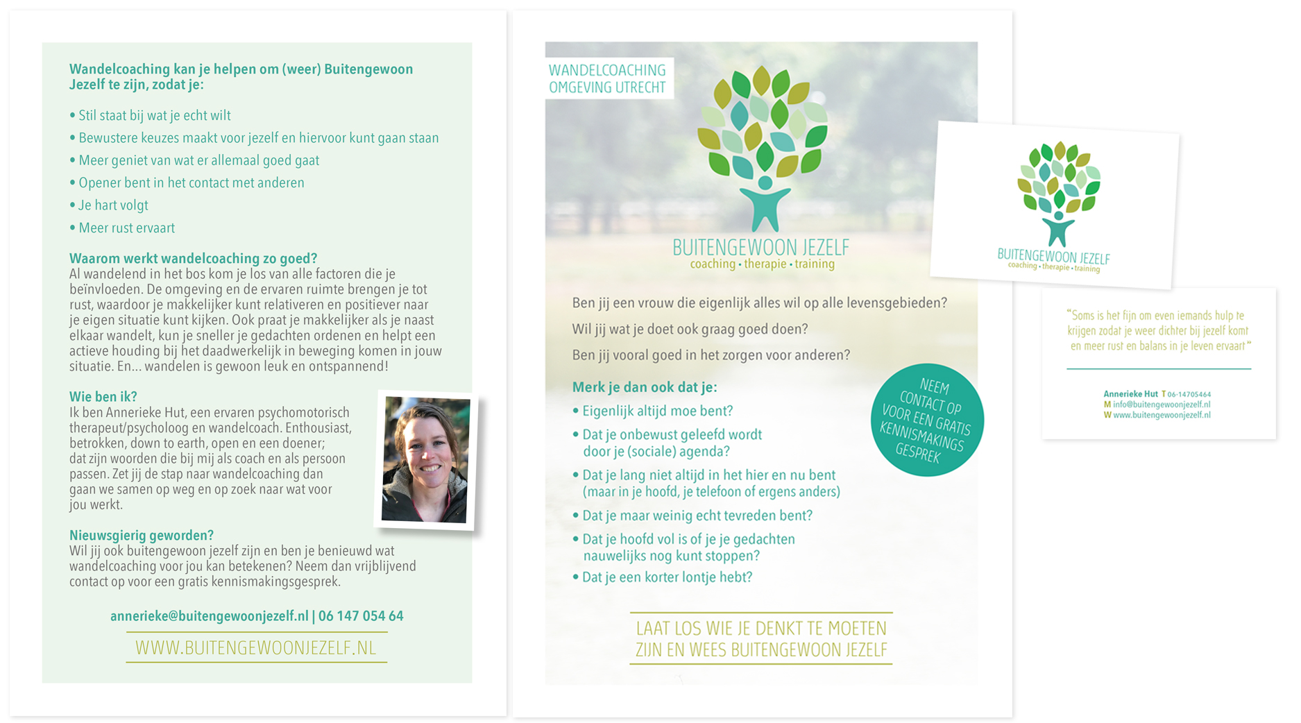 Voor een wandelcoach met passie voor haar vak is een passende huisstijl en een website ontworpen. Het resultaat is : Buitengewoon Jezelf