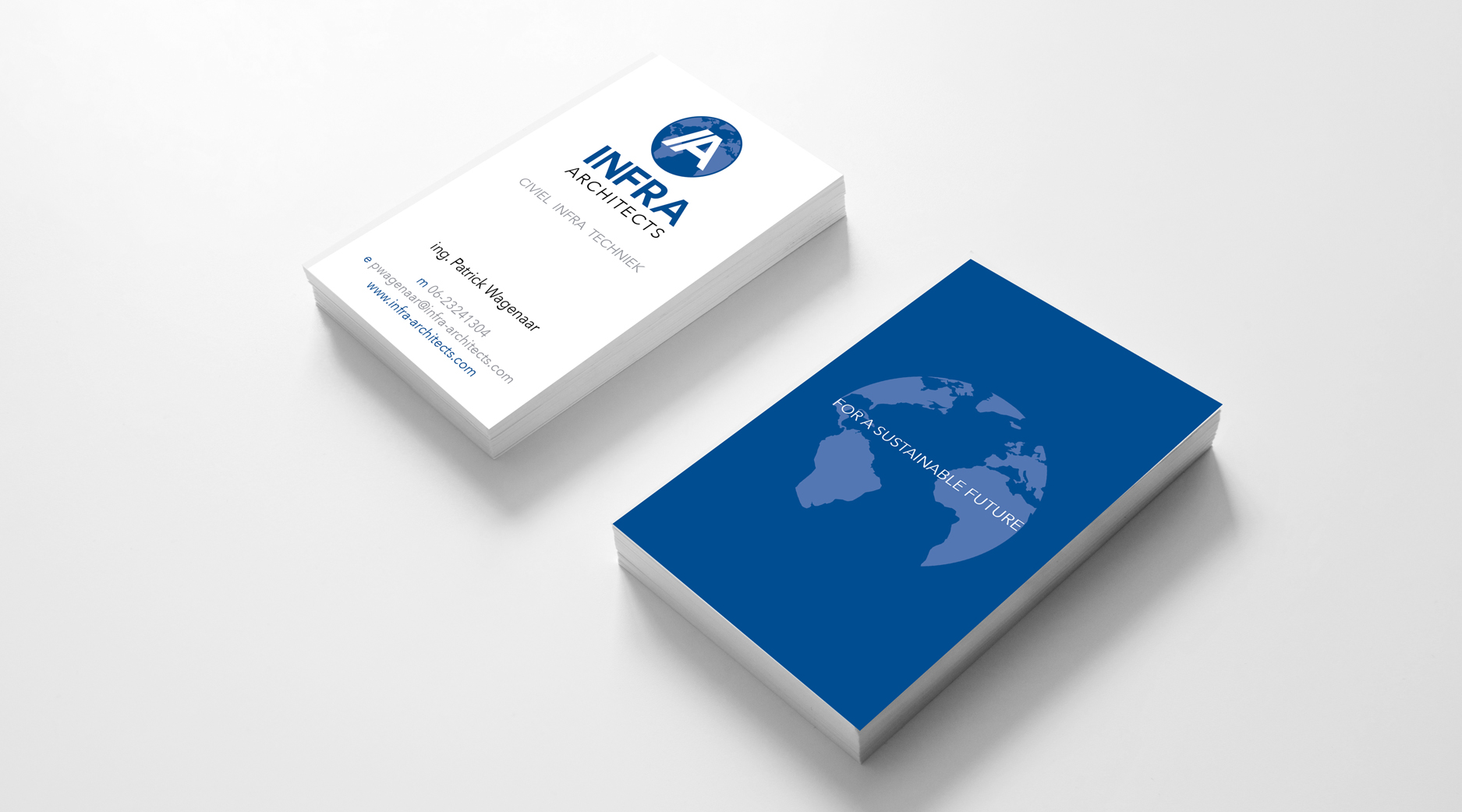 Infra Architects staan voor een no-nonsens team op gebied van civiele techniek met een grote doorkijk naar de toekomst en daarbij behorende verantwoordelijkheid. Wij hebben het logo en visitekaartje ontworpen.